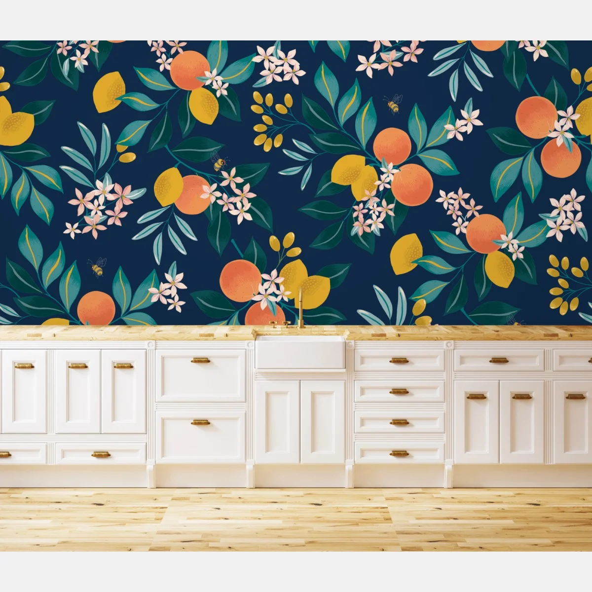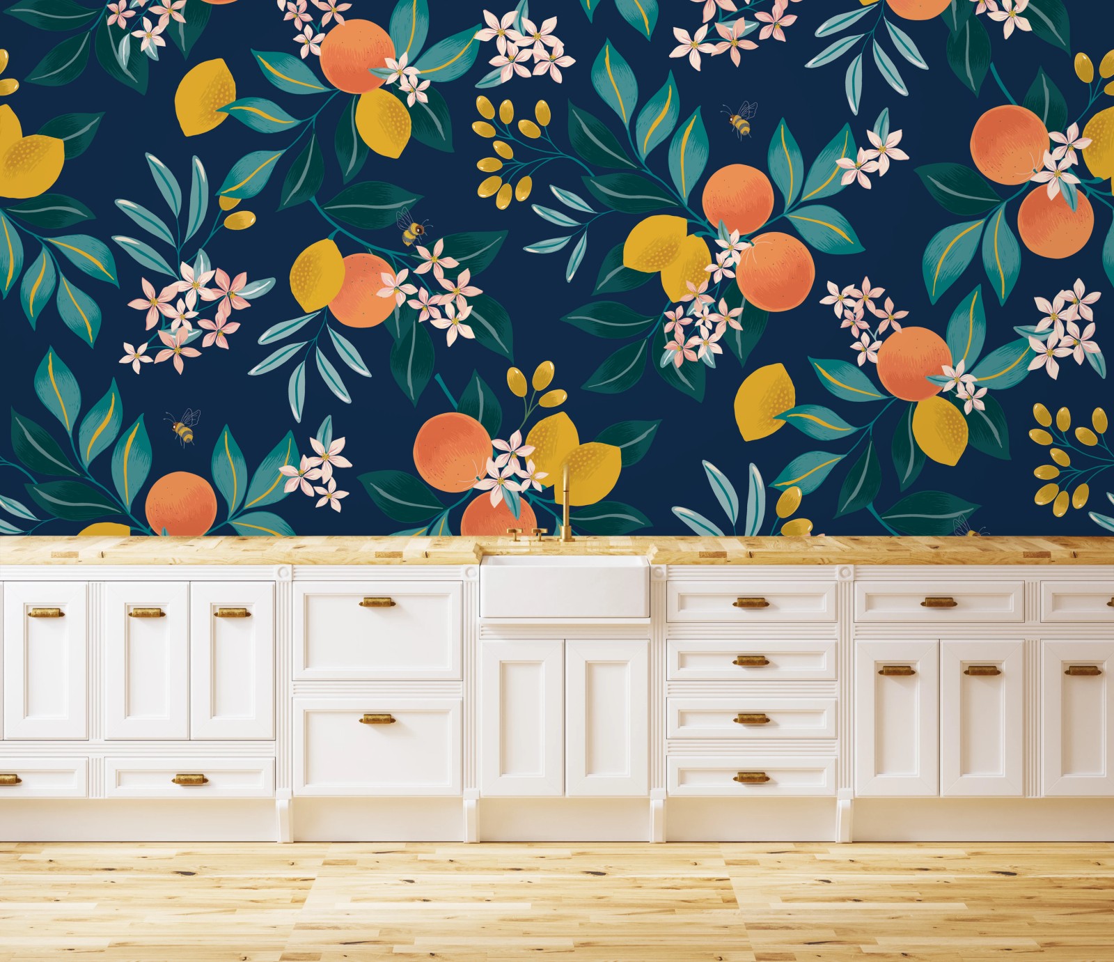 Carta da parati Motivo botanico di agrumi su sfondo blu