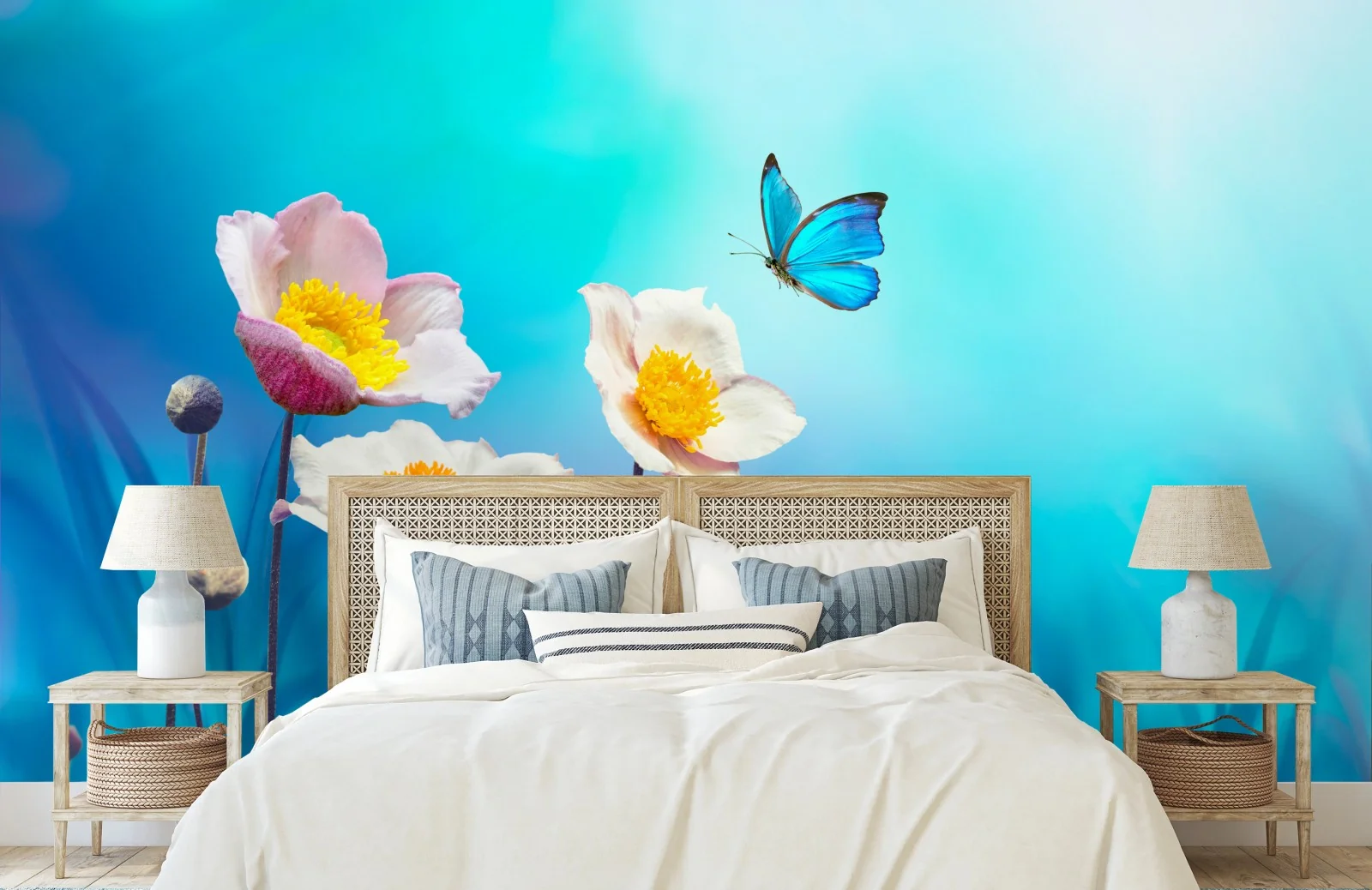 Carta da parati Anemoni rosa e farfalla blu su sfondo celeste