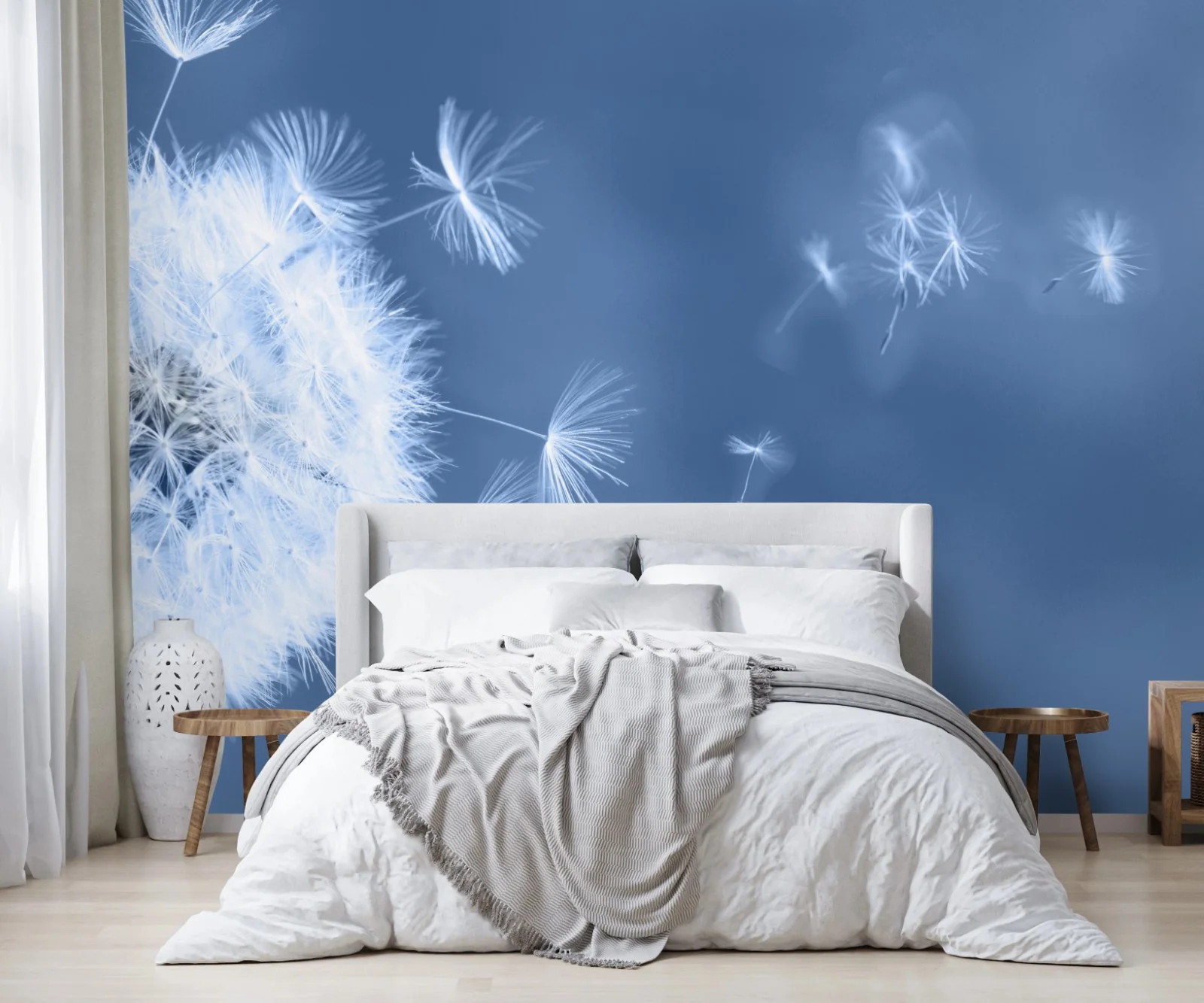 - natura, volo, minimalismo, relax, soffione, dente di leone, semi, sfondo blu, vento, delicatezza