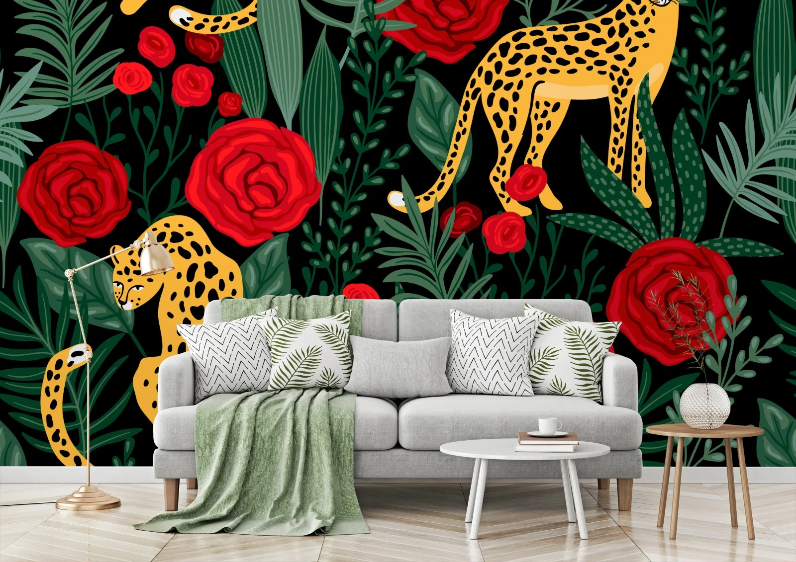 Carta da parati Felini maculati e rose su sfondo nero