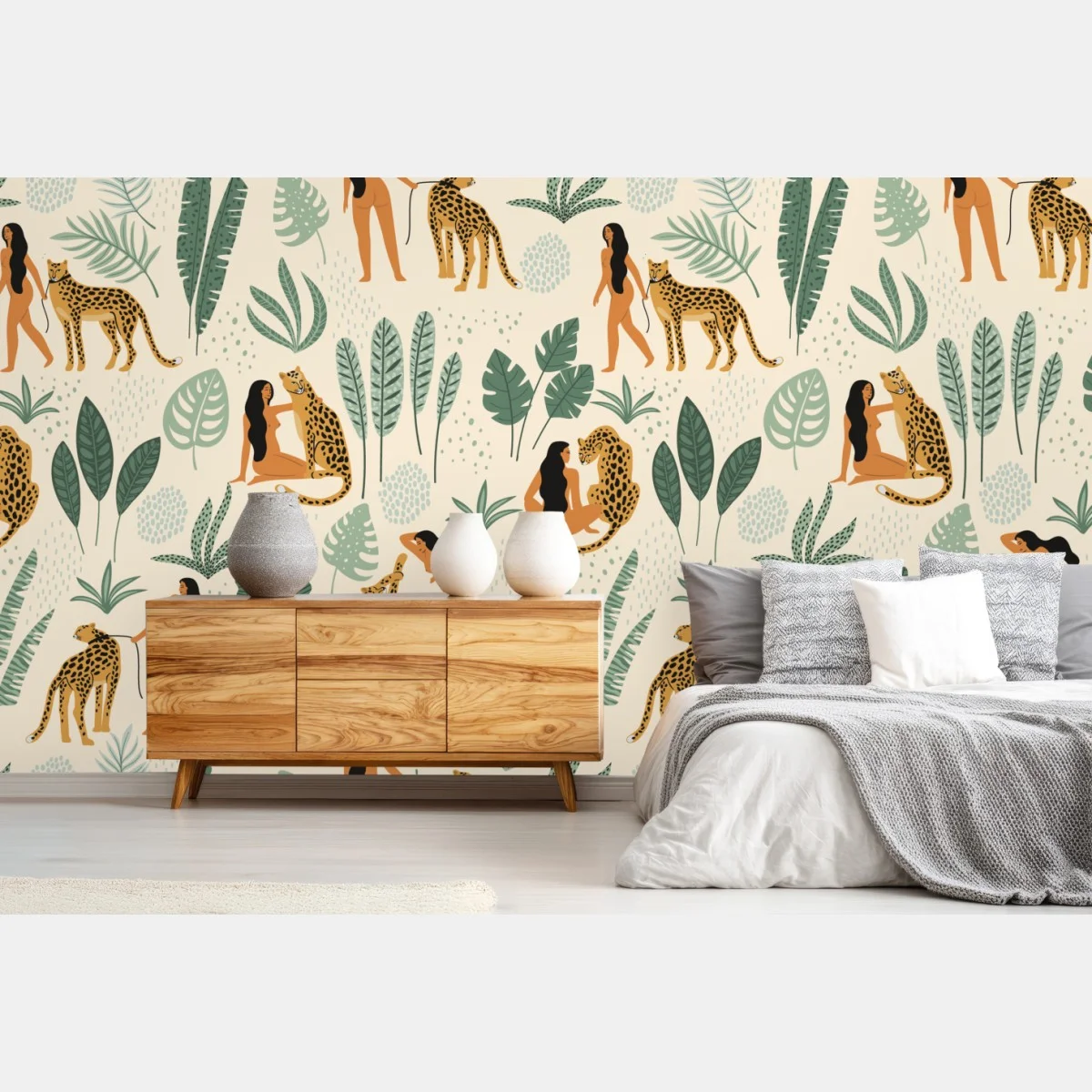 - fogliame, illustrazione, pattern, botanico, motivo tropicale, boho, arte murale, donne, ghepardi, colori tenui
