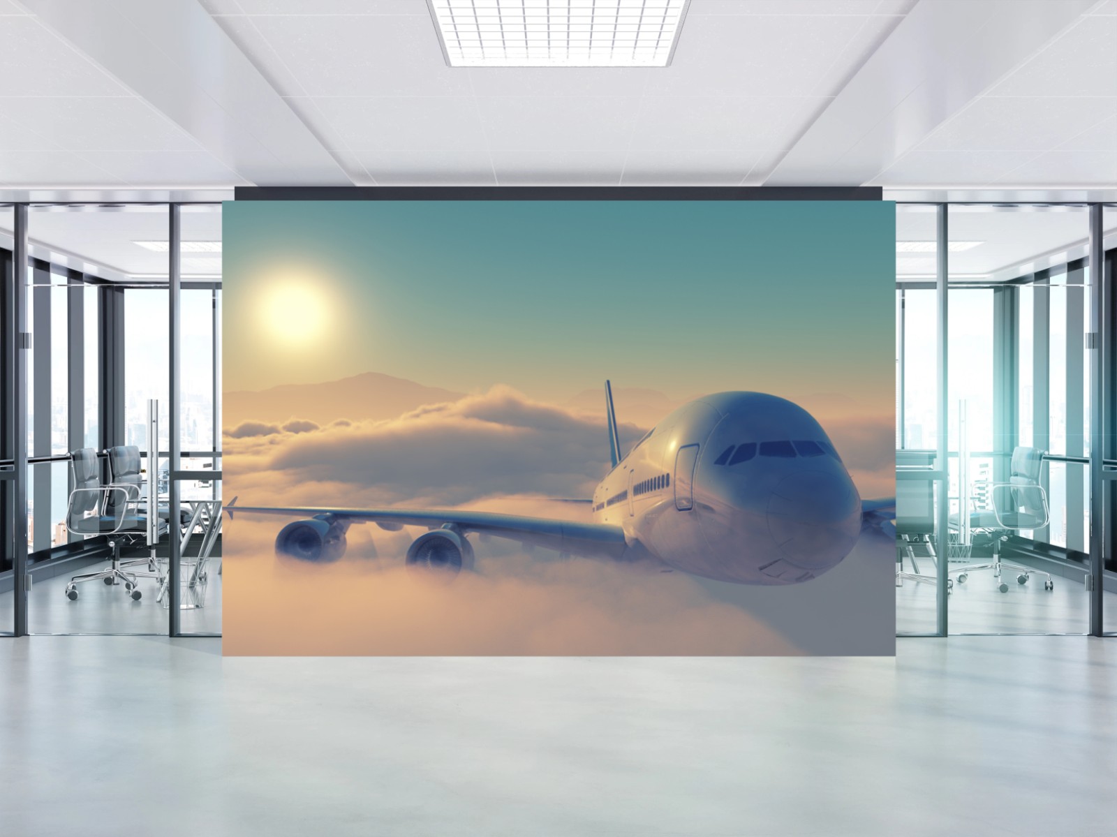 Ammira l'emozione del volo con questa suggestiva immagine di un aereo che attraversa le nuvole al tramonto; i toni caldi e i dettagli realistici creano un'atmosfera di avventura e serenità ideale per valorizzare ogni ambiente.Di piùMeno