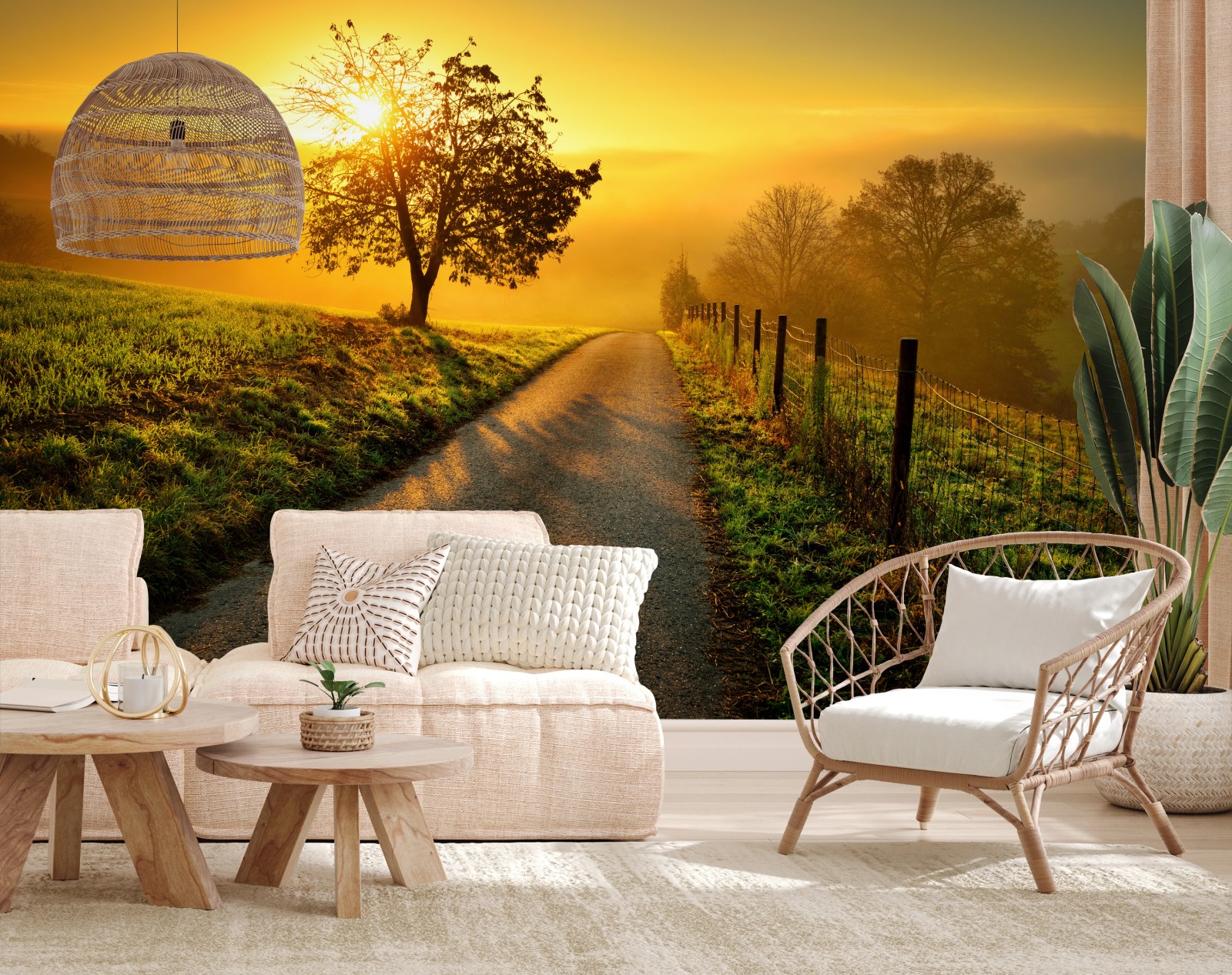 - prato, campagna, sentiero, alba, luce dorata, paesaggio rurale, atmosfera tranquilla, collina, foschia, albero solitario