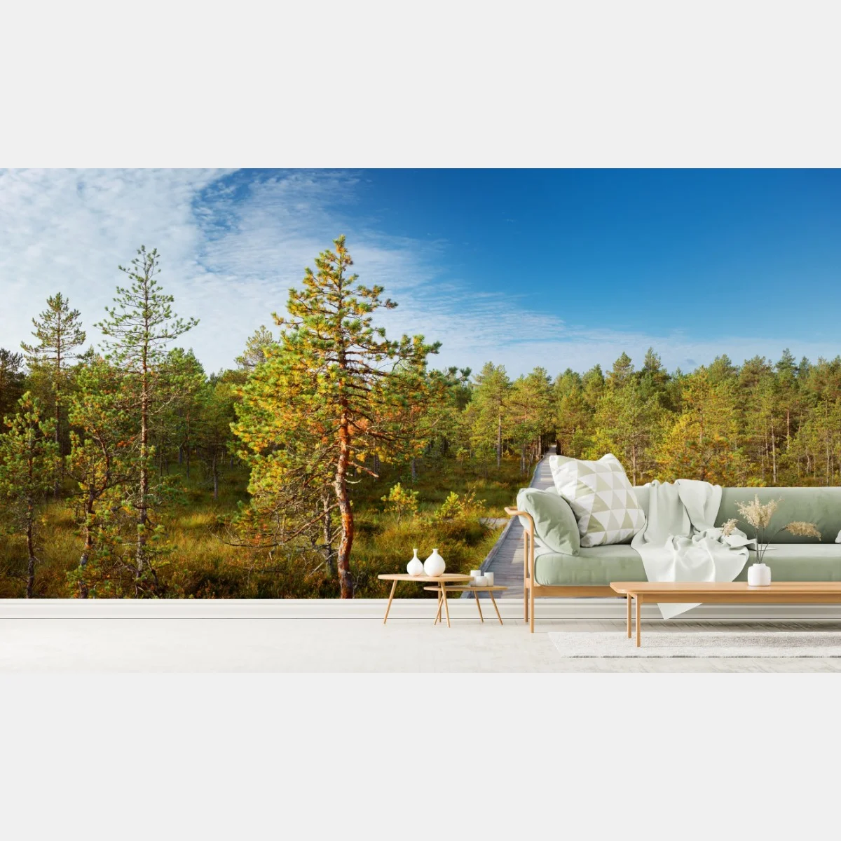 Carta da parati Passerella nella palude tra pini