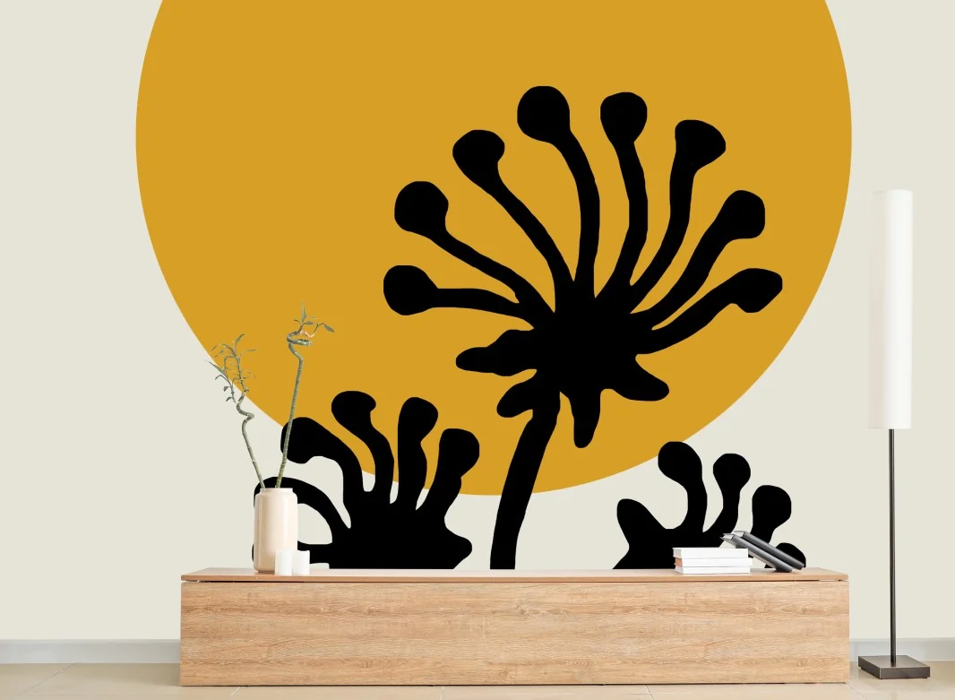 Carta da parati Sole dorato e fiori in silhouette