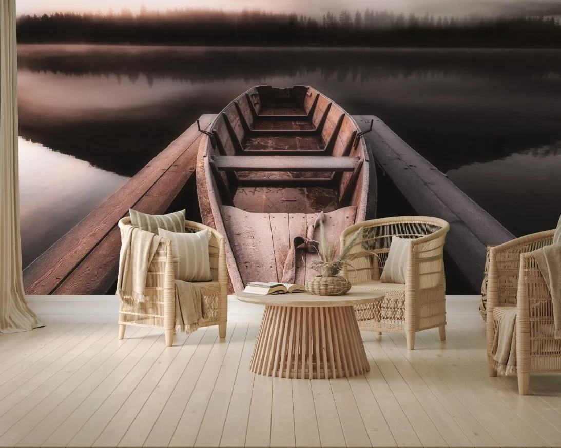 Immergiti in un'atmosfera di calma e contemplazione con questa scena di una barca in legno su un lago nebbioso incorniciato da maestose montagne, ideale per aggiungere un tocco di serenità agli ambienti.Di piùMeno