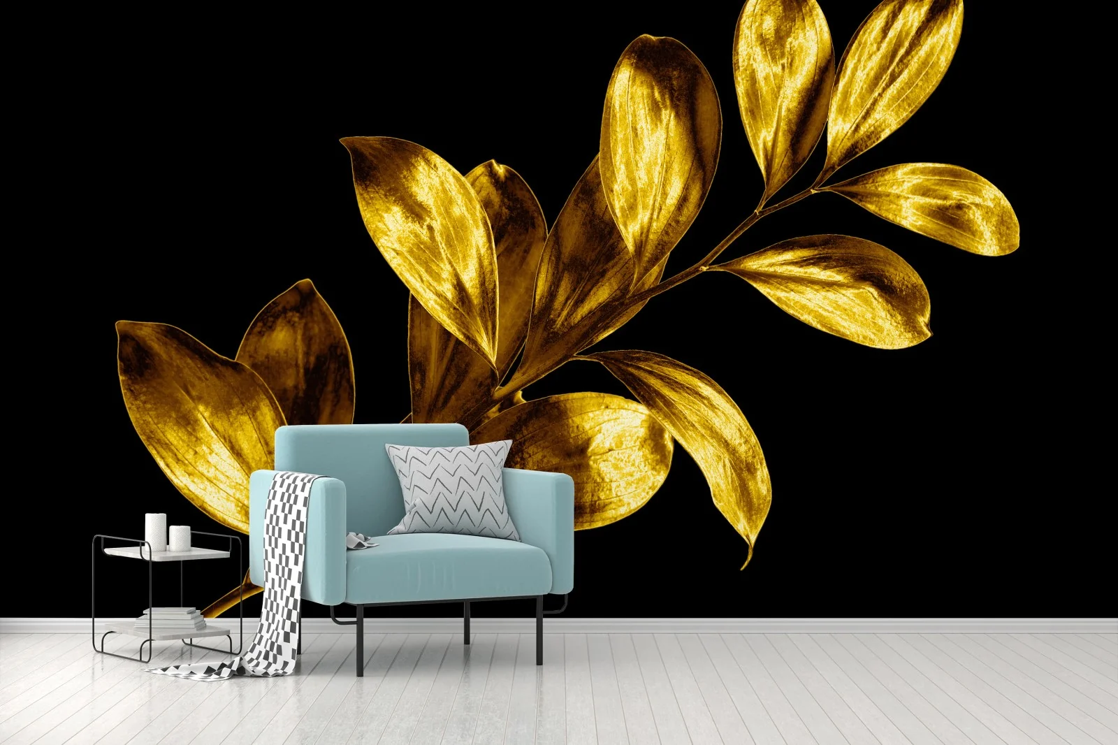 - decorazione, elegante, minimalista, lusso, oro, sfondo nero, foglie dorate, contrasto, ramo dorato, design botanico