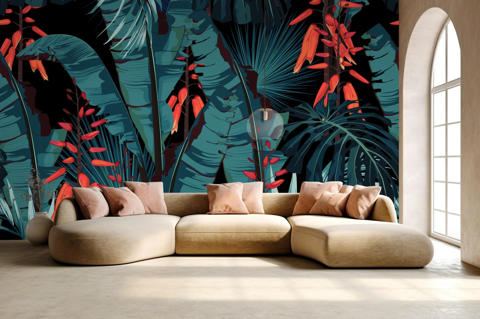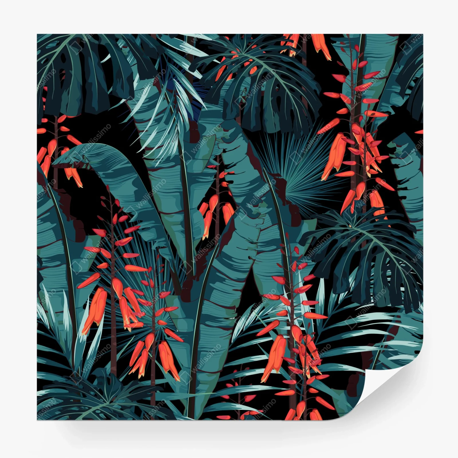Carta da parati Motivo tropicale notturno con foglie turchesi e fiori corallo