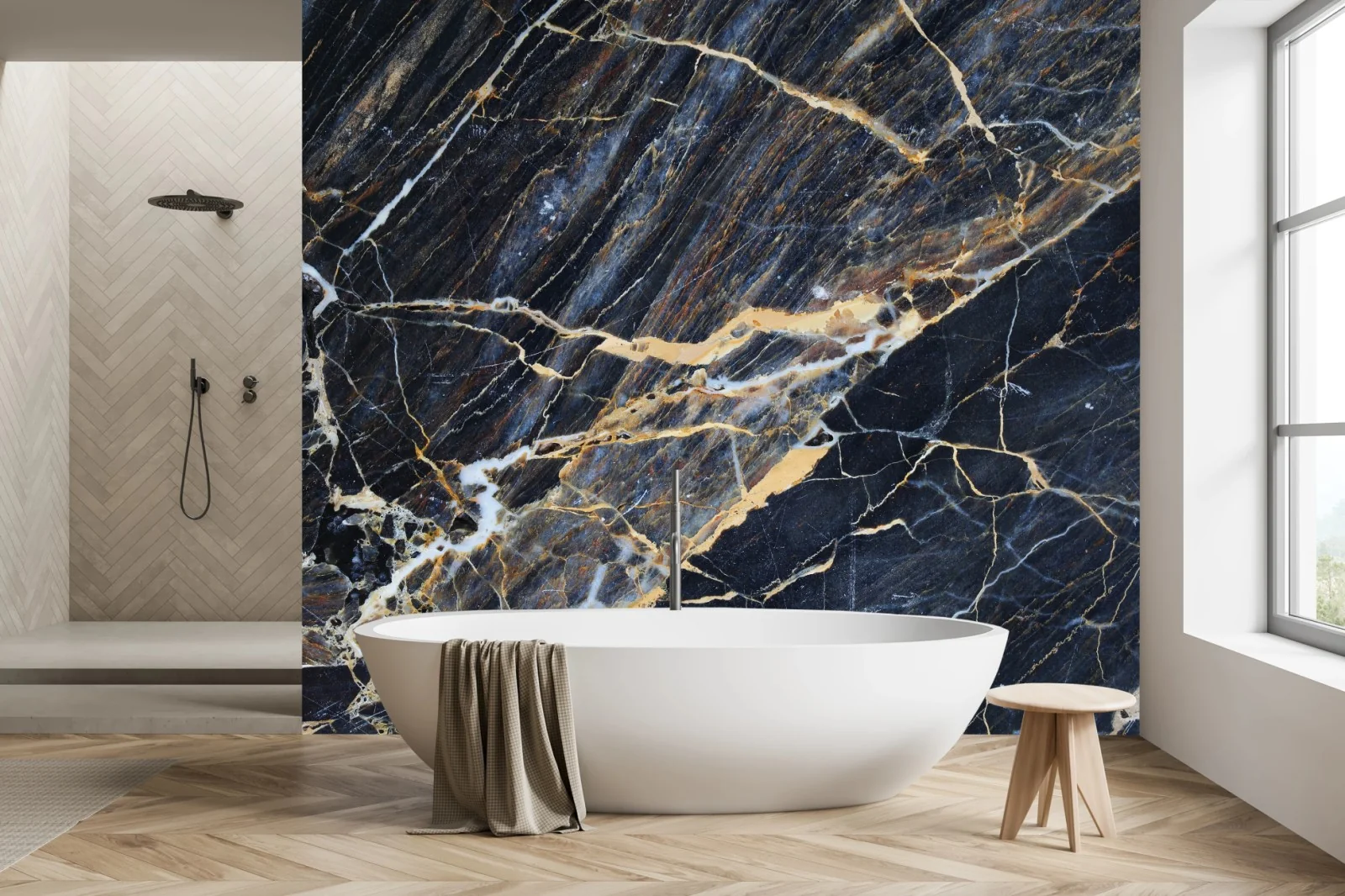 - lusso, arte contemporanea, decorazione murale, marmo blu scuro, venature dorate, venature crema, texture marmo, sfondo astratto, design elegante, finitura lucida