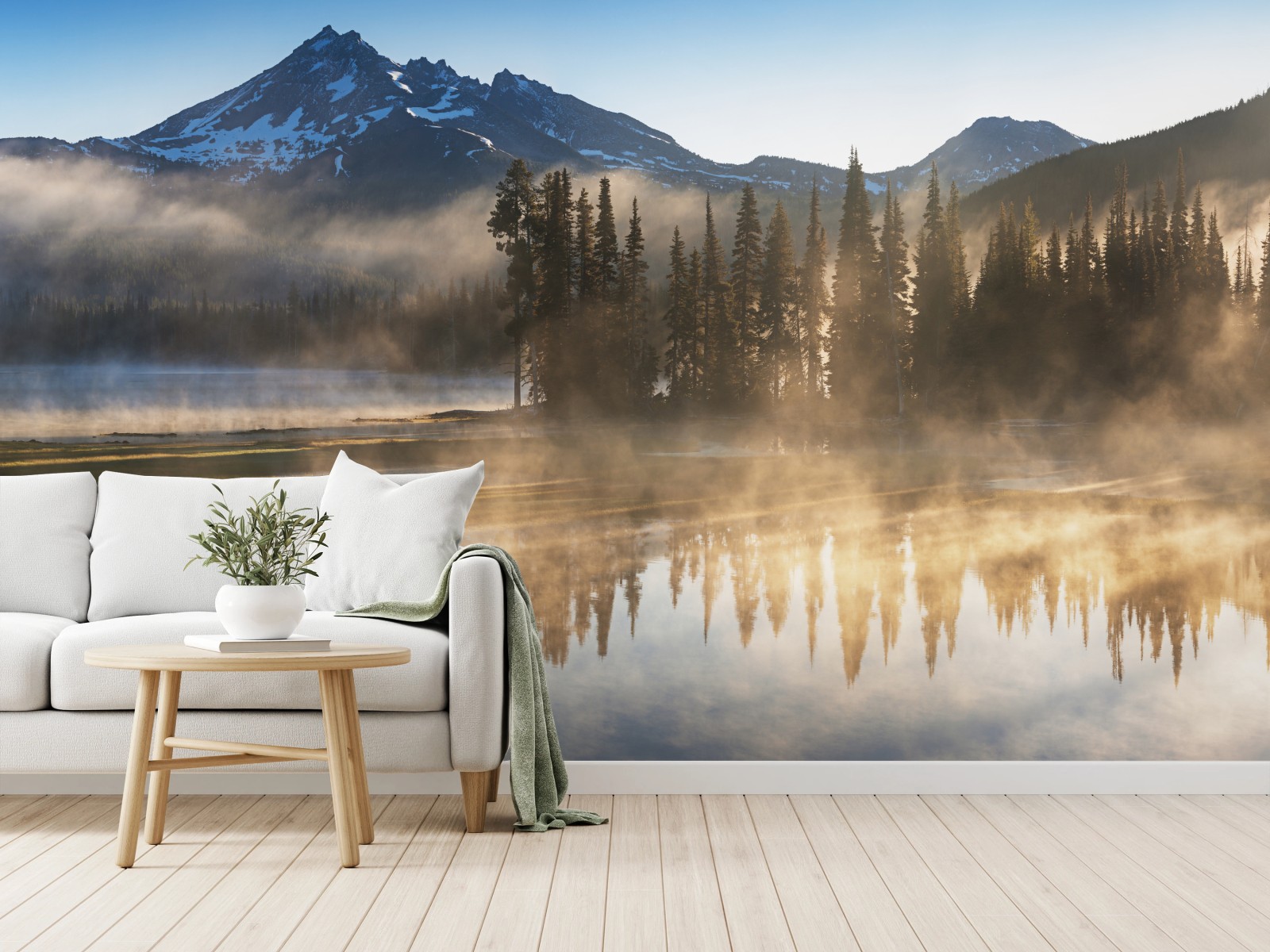 Carta da parati Mattino nebbioso sul lago con riflessi alpini