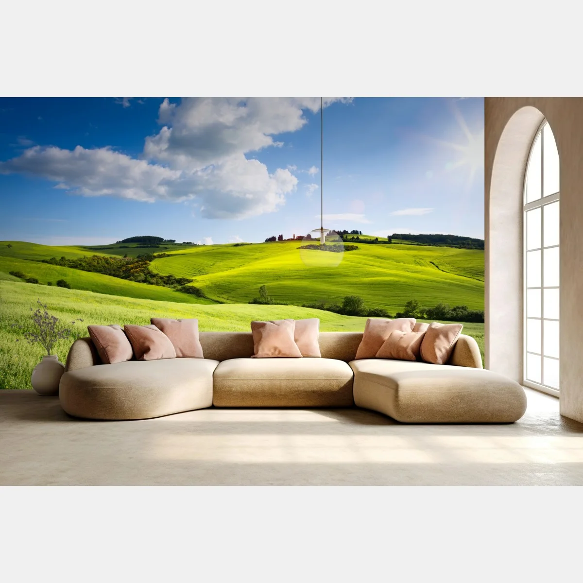 - paesaggio, cielo azzurro, prateria, tramonto, luce dorata, colline verdi, colline toscane, campagna italiana, fattoria, panorama rurale