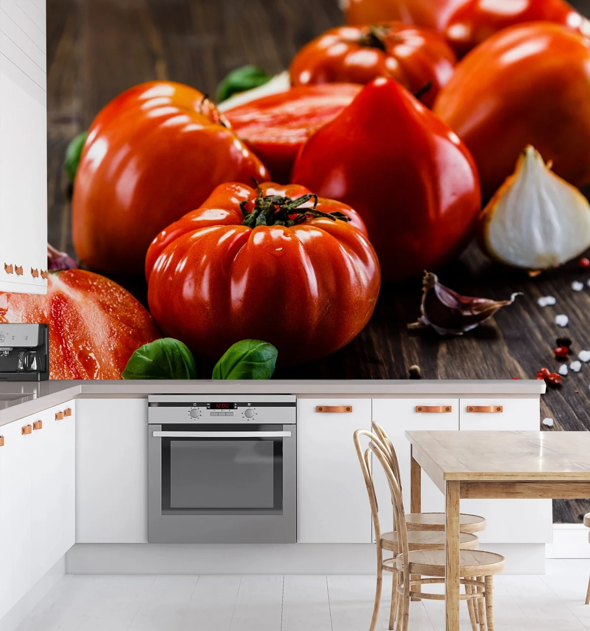 Carta da parati Pomodori rustici e basilico su tavola in legno