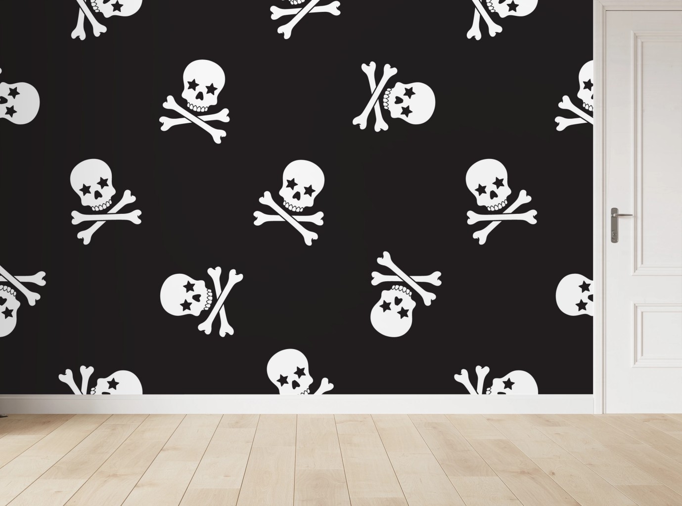 Design d'impatto con motivo di teschi e ossa incrociate in bianco e nero, perfetto per creare un'atmosfera alternativa e audace in camere, negozi o spazi creativi.Di piùMeno