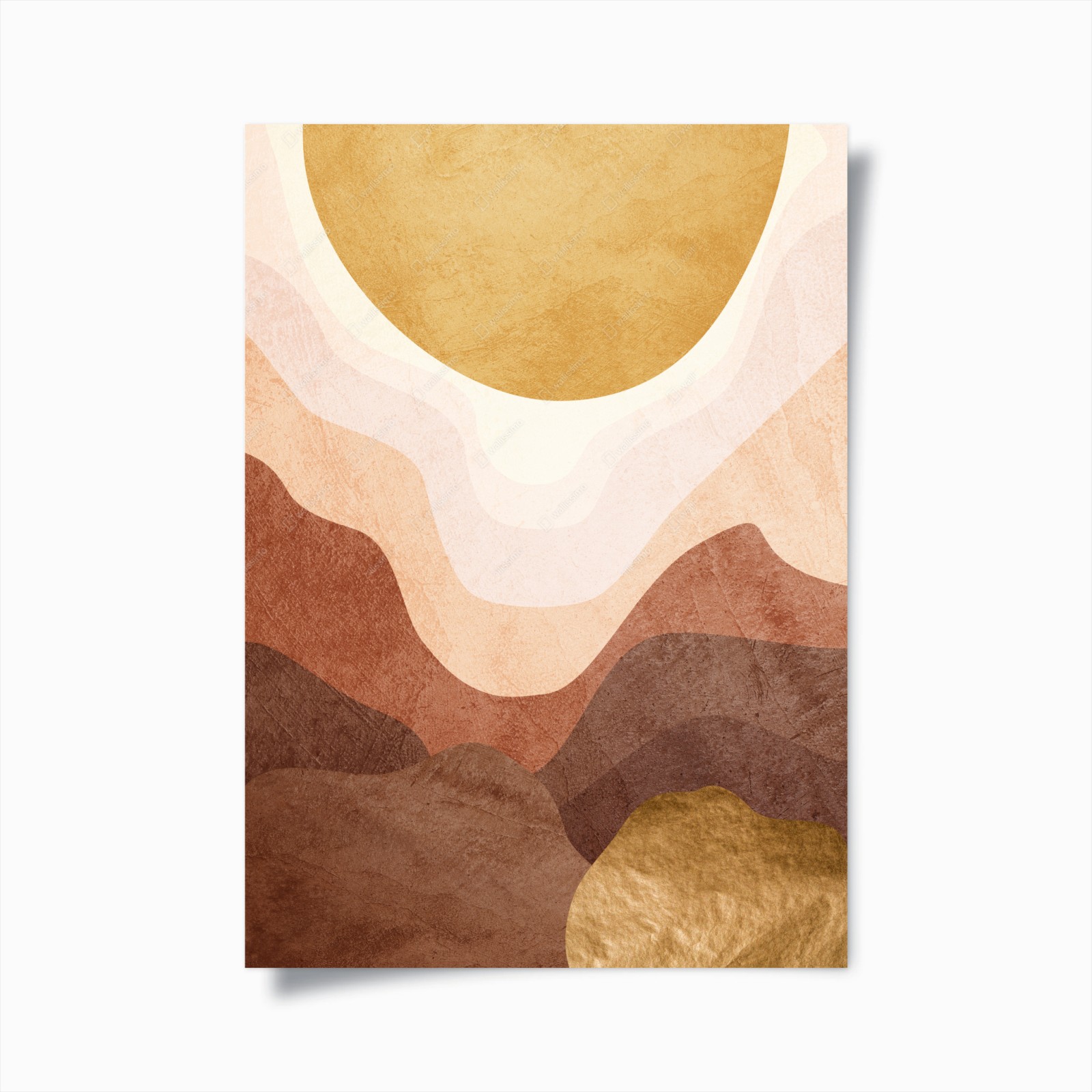 - minimalista, decorazione parete, arte moderna, paesaggio astratto, boho, toni terra, texture carta, sole dorato, montagne stratificate, design organico