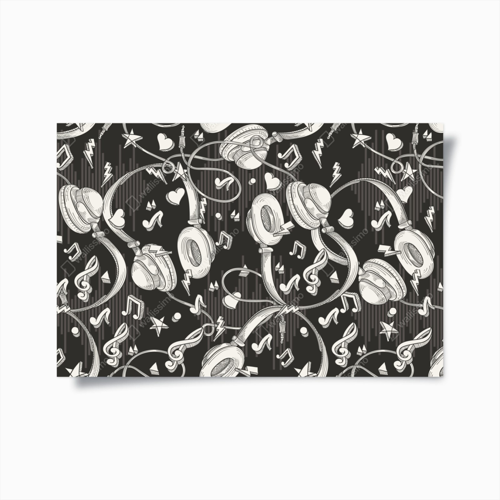 - motivo, cavi, musica, note musicali, monocromatico, cuori, stelle, fulmini, cuffie, chiave di violino