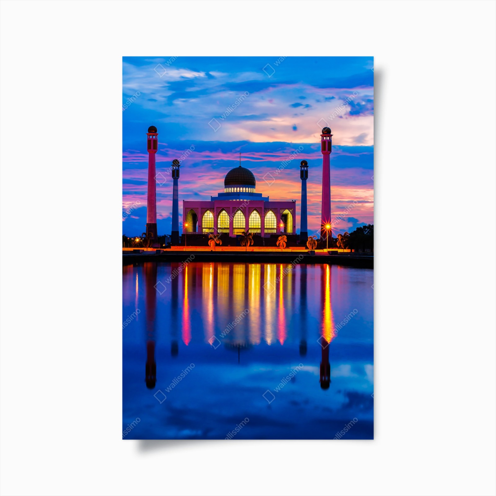 - lago, architettura, riflesso, tramonto, serenità, cielo colorato, colori vividi, paesaggio notturno, moschea, minareti