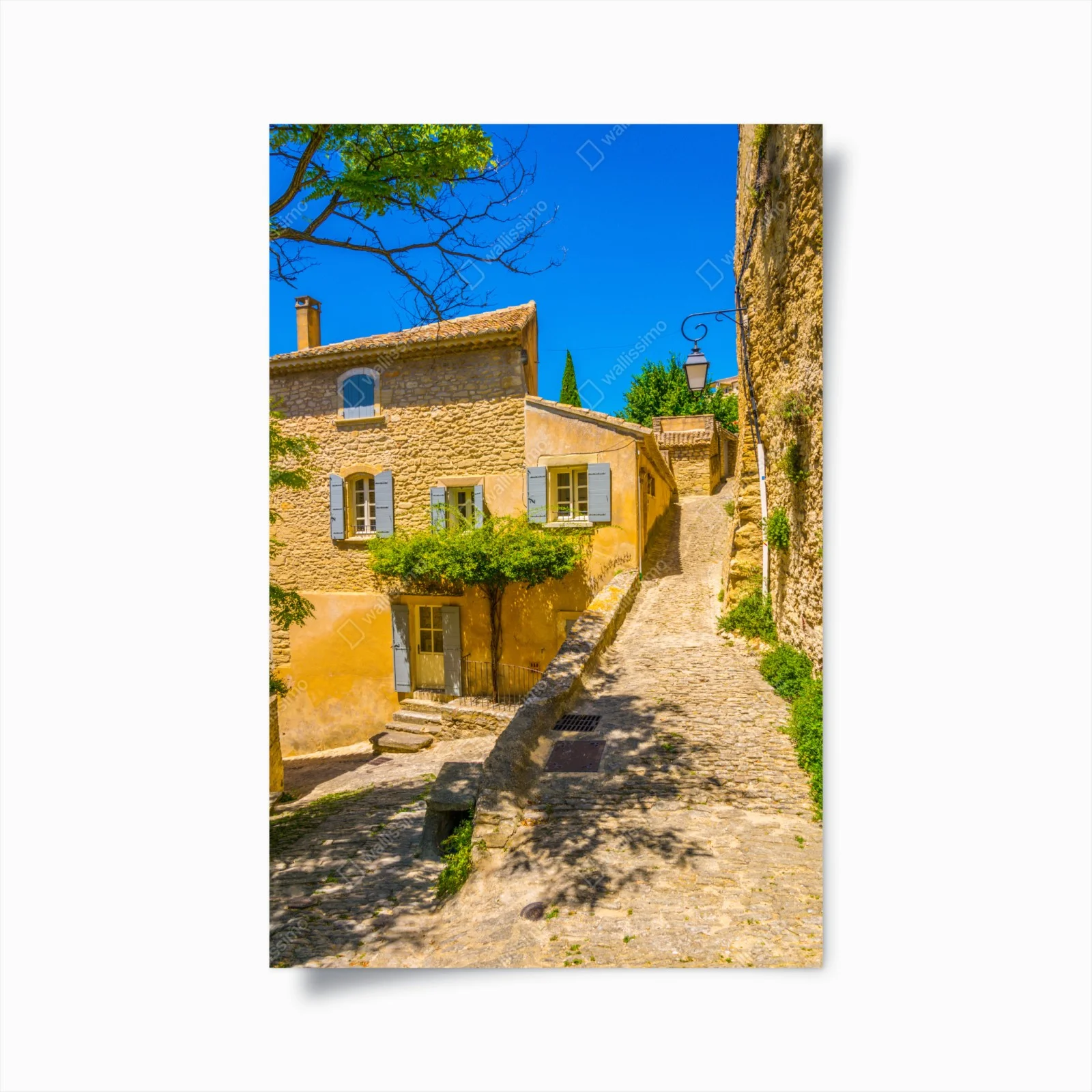 - luce solare, strada acciottolata, villaggio, provenza, architettura rurale, vicoletto, casa in pietra, persiane azzurre, muri antichi, alberi ombreggianti