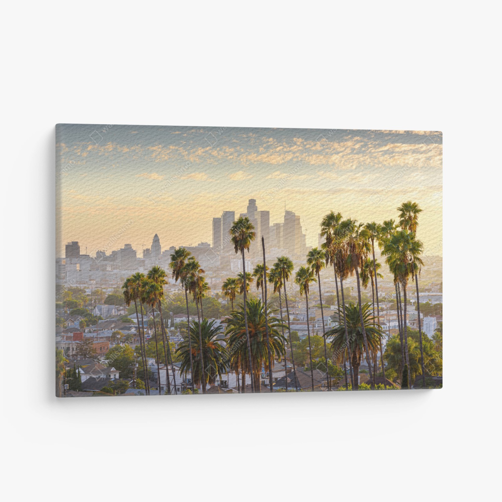 Quadro su tela Tramonto su Los Angeles tra palme e grattacieli
