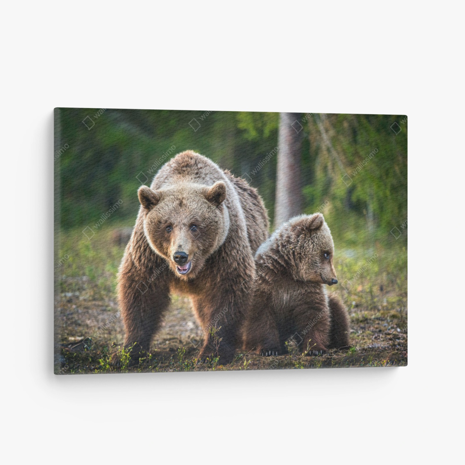 Quadro su tela Orso bruno con cucciolo nella foresta